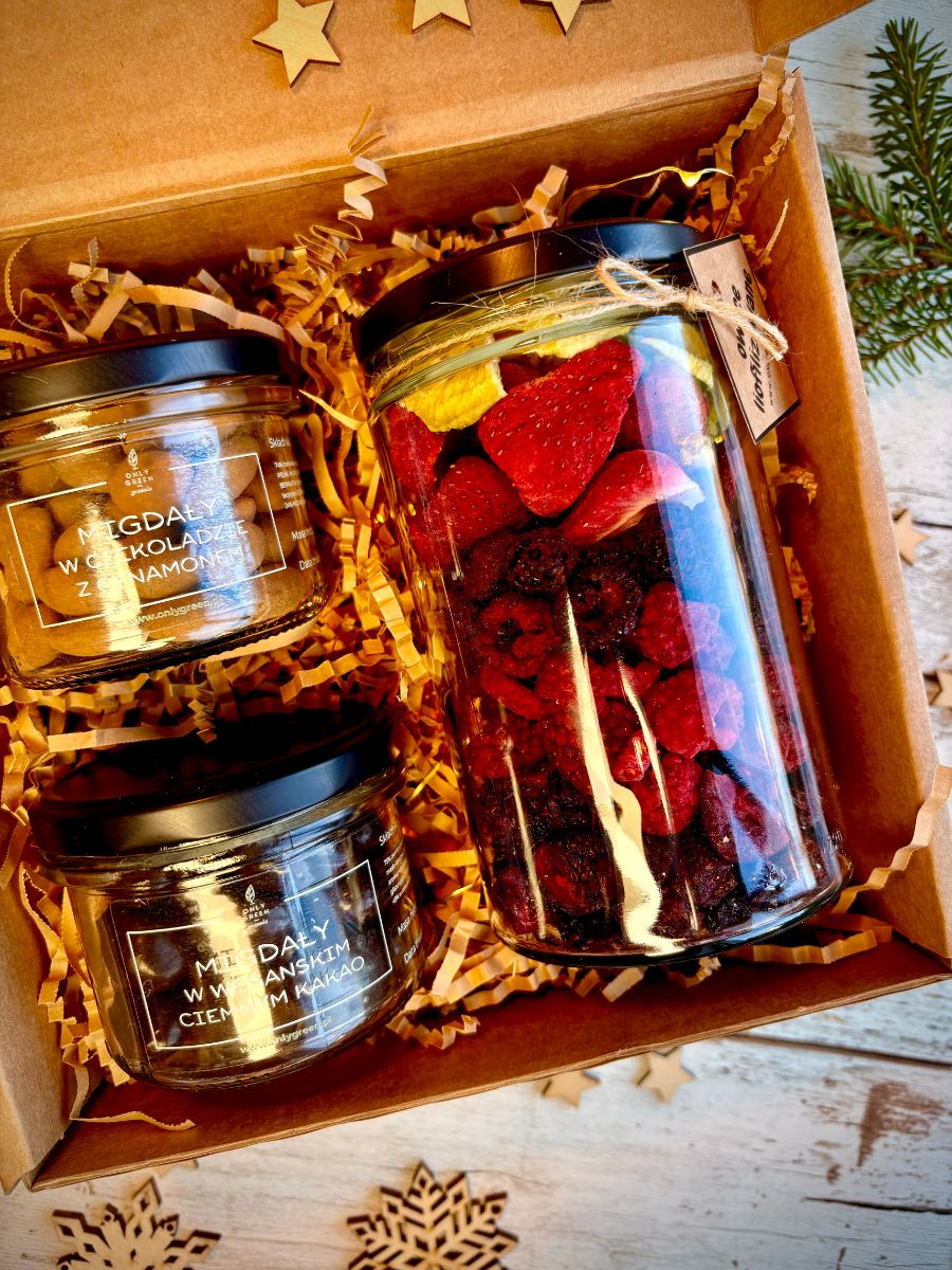 Zestaw Prezentowy Zimowa Bajka to prawdziwa uczta dla zmysłów i serca, idealna na chłodne, zimowe dni. Duży słoik pełen liofilizowanych owoców wprowadza kolor, chrupkość i naturalną słodycz do każdego deseru, jogurtu czy porannej granoli. Dla miłośników wyrafinowanych smaków przygotowaliśmy migdały w ciemnym wegańskim kakao, które łączą delikatną słodycz orzechów z głębokim, kakaowym aromatem – idealna roślinna przekąska na każdą chwilę relaksu. Z kolei migdały w mlecznej czekoladzie z cynamonem to połączenie aksamitnej słodyczy, chrupkości i subtelnej, korzennej nuty, które przenosi w magiczny, świąteczny klimat. Całość zestawu to harmonia smaków, aromatów i zdrowych składników, które sprawiają, że każda chwila staje się wyjątkowa. Zimowa Bajka to prezent, który otula ciepłem, słodyczą i naturalną radością, idealny do dzielenia się z bliskimi.